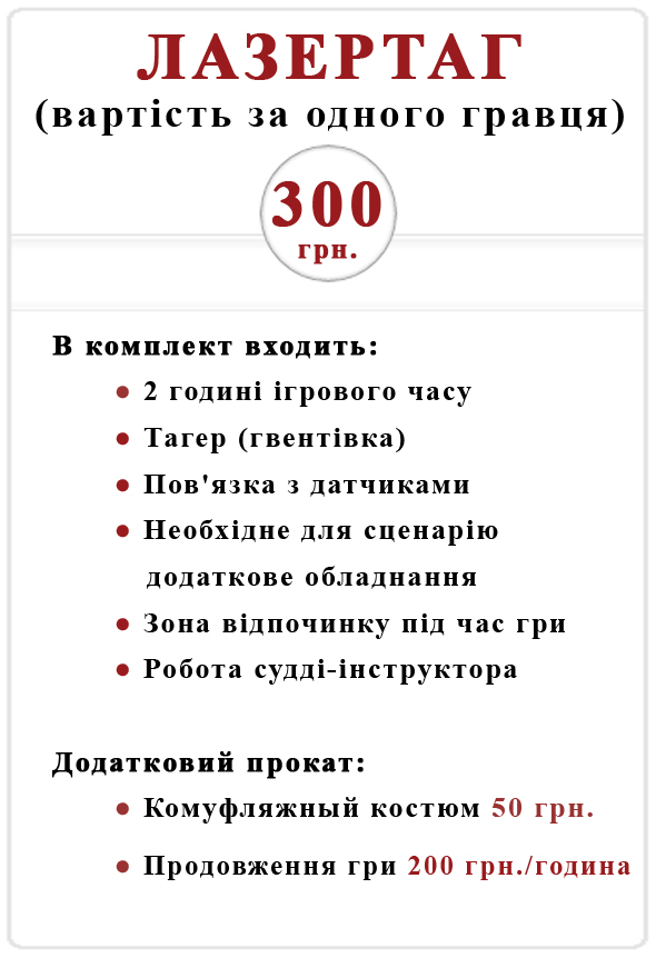 Розвага підходить для гравців від 6 років, кількість учасників — від 2 до 20 осіб. Загальна тривалість — до 3 годин, що гарантує повне занурення і масу позитивних емоцій.